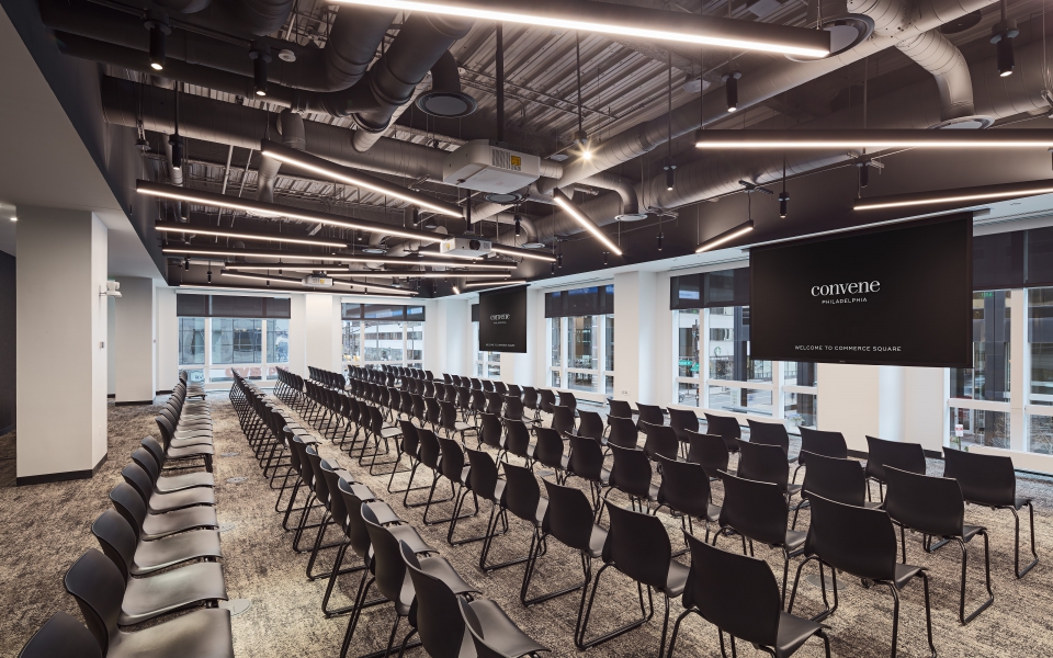 Convene Commerce Square offers 30,000 square feet of space with 11 reservable spaces suitable for offsite trainings, conferences, or large receptions up to 260 participants.