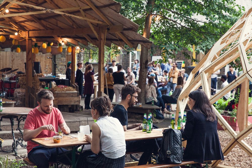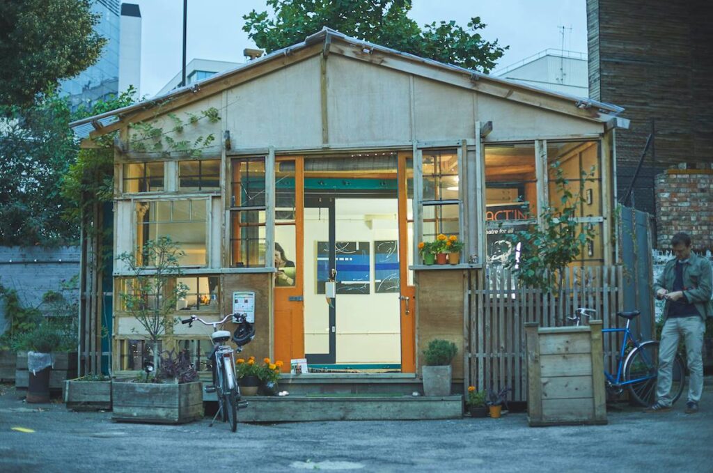 A serene garden is sheltered by mature trees, providing a social space and atmospheric backdrop to this unique cluster of studios for creative minds.