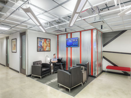 This center boasts a modern look with exposed ceilings and concrete floors. The quaint, loft-style business lounge comes equipped with furniture and WIFI. You can collaborate with ease in our private team spaces.