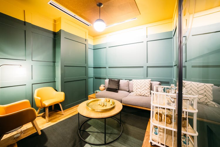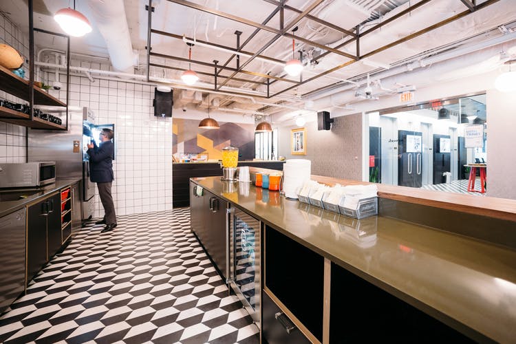 – Dedicated meeting spaces include A/V gear and unexpected details like custom wallpaper and marble tables.