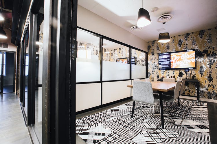 – Dedicated meeting spaces include A/V gear and unexpected details like custom wallpaper and marble tables.