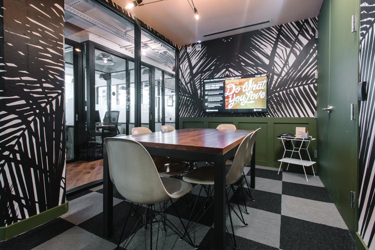 – Dedicated meeting spaces include A/V gear and unexpected details like custom wallpaper and marble tables.