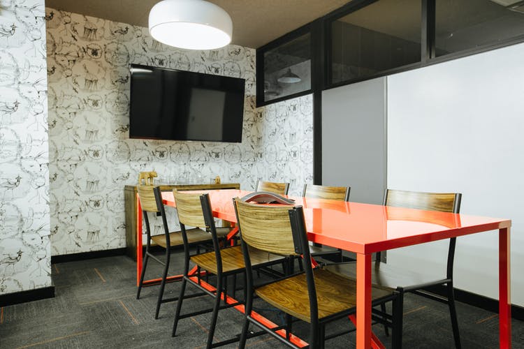 – Dedicated meeting spaces include A/V gear and unexpected details like custom wallpaper and marble tables.